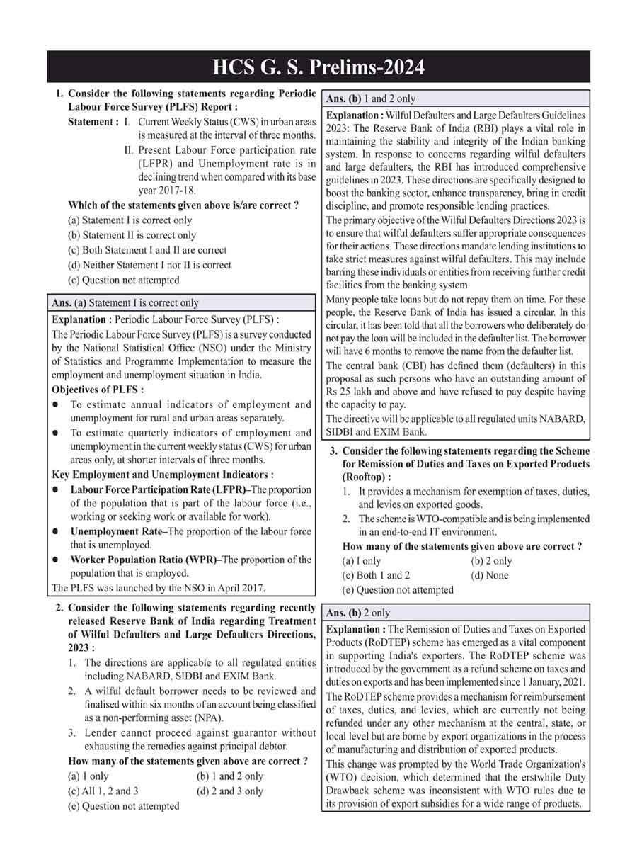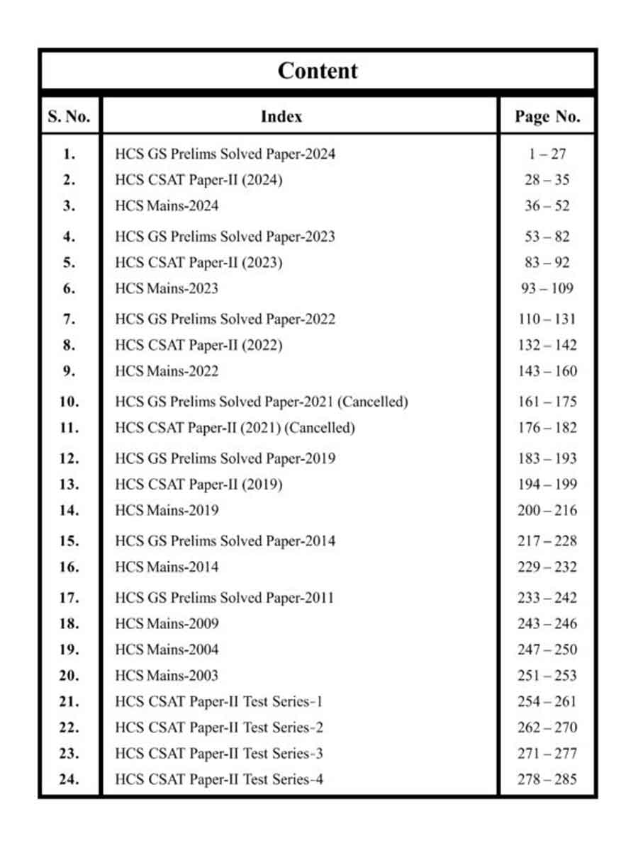 - HCS General Studies Prelims Paper I Covers solved papers from 2011 to 2024, with clear explanations to help you understand exam trends and question patterns.